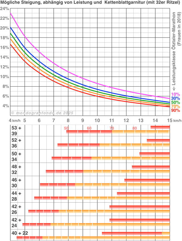 - 50% der Ötztaler-Teilnehmer erreichen an einem 10%-Anstieg maximal 7,4 km/h (Schnittpunkt der grünen 50%-Kurve mit der 10%-Steigungslinie). Um im 10%-Anstieg mit 70 U/min pedallieren zu können, benötigen sie eine Untersetzung von bis zu 26/32. Wer mehr leistet, kommt mit einem größeren Gang aus (z.B. mit 34/32 und mehr in der 10%-Klasse). Wer weniger leistet, braucht eine noch größere Untersetzung (z.B. in der 70%-Klasse bis zu 24/32) oder muss mit ineffezient niedriger Frequenz treten (z.B. in der 90%-Klasse mit unter 50 U/min, wenn 32/32 montiert ist).